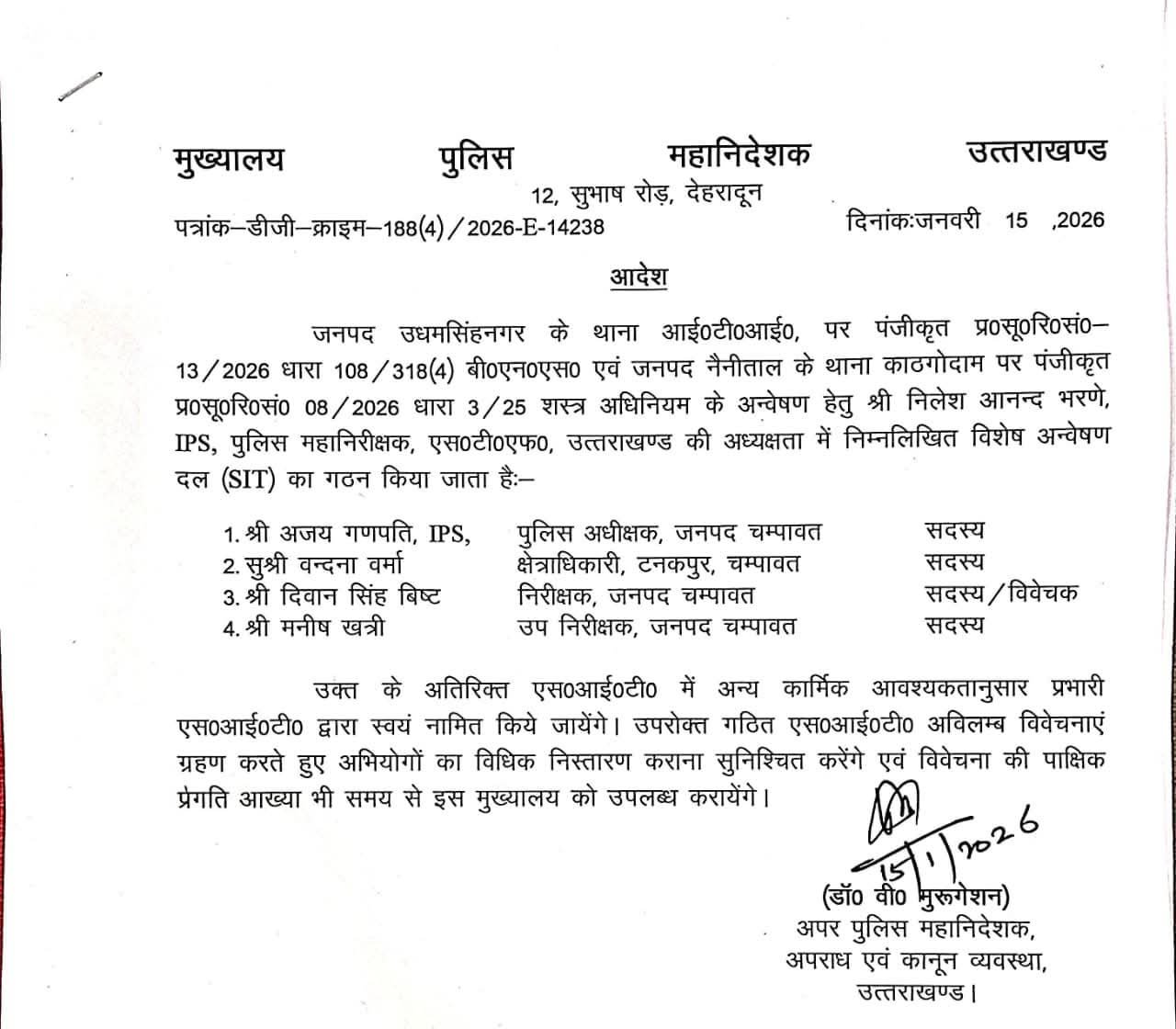 जनपद ऊधमसिंह नगर के ग्राम पैगा, थाना आईटीआई निवासी श्री सुखवन्त सिंह द्वारा 10/11 जनवरी, 2026 की रात्रि काठगोदाम, हल्द्वानी में आत्महत्या किये जाने के प्रकरण में पुलिस मुख्यालय ने सम्बन्धित अभियोगों की गहन विवेचना हेतु पुलिस महानिरीक्षक STF श्री नीलेश आनन्द भरणे की अध्यक्षता में 5 सदस्यीय विशेष अन्वेषण दल (SIT) का गठन किया है।